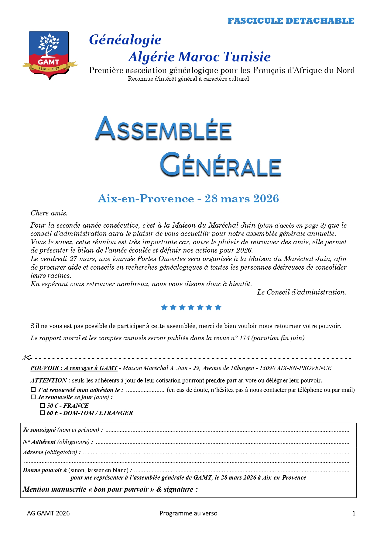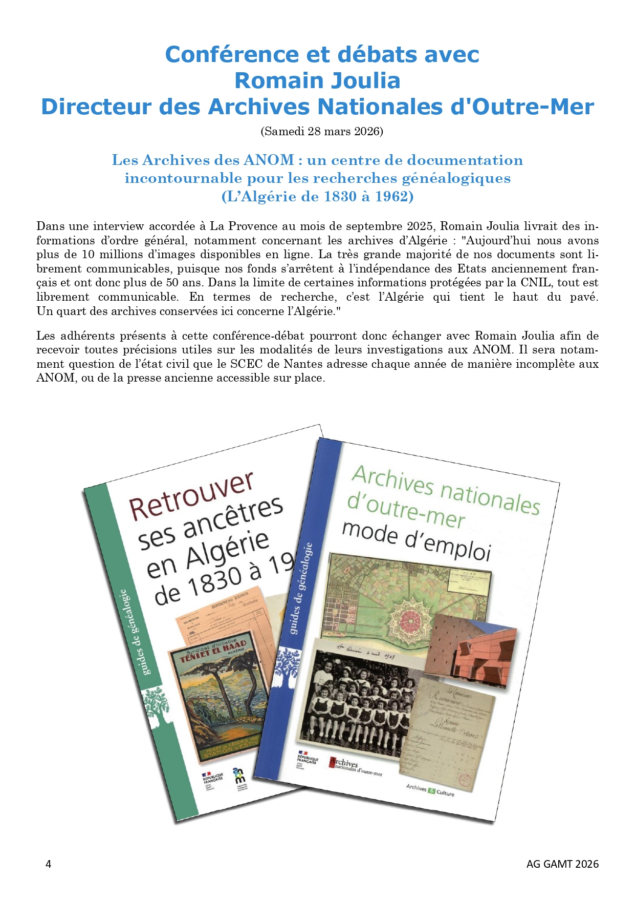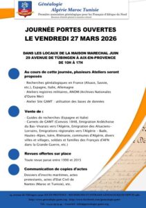Vous êtes né(e) ou de parents nés ou ayant vécu en Afrique du Nord période française (1830-1962). Vous recherchez vos origines, l’histoire de vos ancêtres ? Notre association Généalogie Algérie Maroc Tunisie, créée il y a maintenant 40 ans et reconnue « d’intérêt général » est là pour vous aider !
